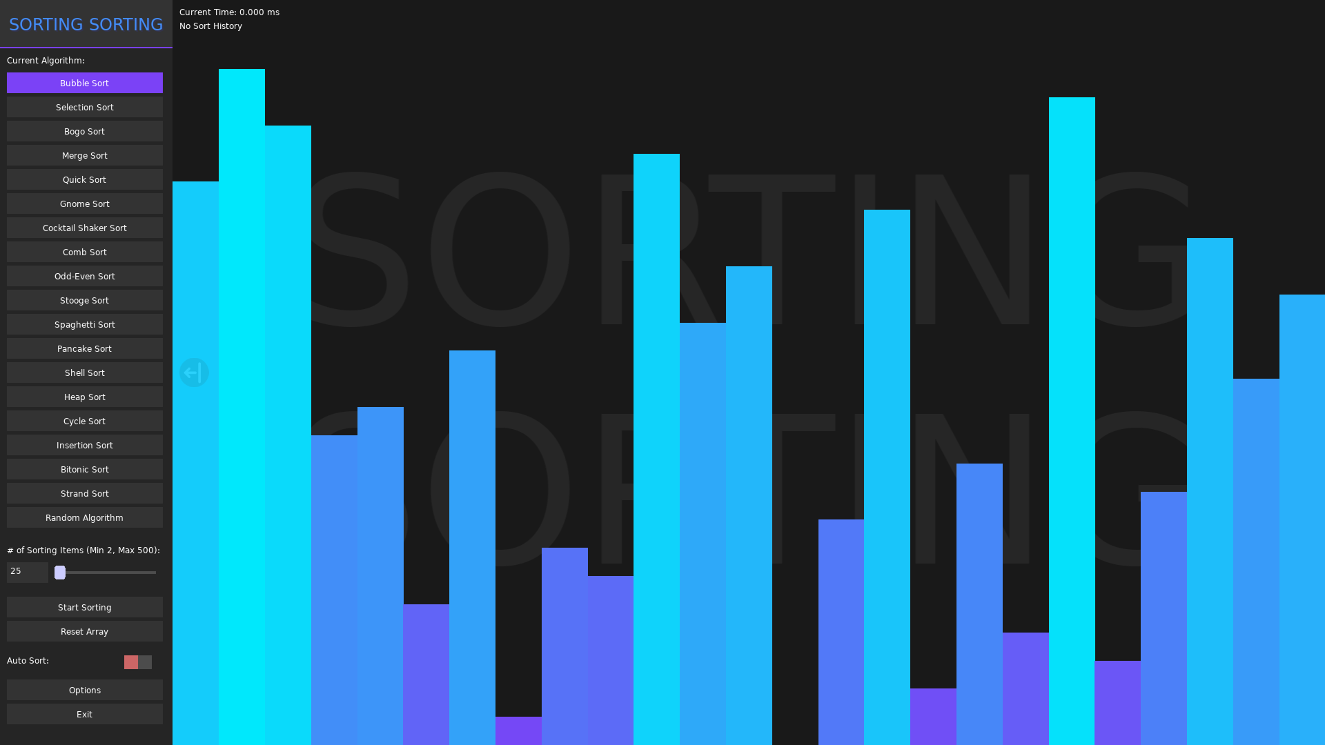 Pick from a huge variety of sorting methods, classics like Merge Sort and Quick Sort, oddballs like Bogo Sort and Pancake Sort, or select "Random" and explore them all. Adjust the number of items, watch bars swap, merge, and shuffle in real-time, and compare how long each algorithm takes to finish. Don't forget to customize your colors too!